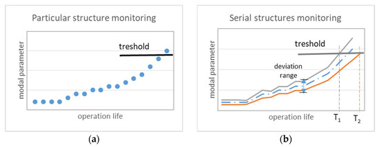 The thresholds of modal parameters for particular structure are determined using simulation and tests of the structure in its reference state. In the case of serial structures, the thresholds should be common to all samples of the same design. Even a few deviations within the manufacturing process may differentiate mechanical properties of serial samples that variate its modal parameters within a deviation range (Figure 1b). Modal deviations may vary the operational life (T1, T2) for serial samples. With that in mind, the SHM system has to consider both the similarities and differences between serial samples. The universal approach for the evaluation of modal properties using the typical and individual parts of the Modal Passport (MP) was proposed in [18,25,26].