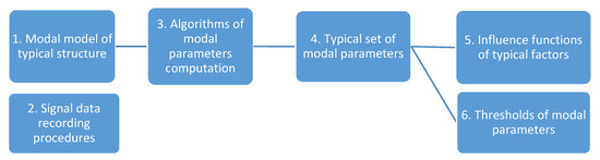 The MP approach considers the application of modal parameters for structural monitoring. The MP considers both the common modal properties of serial samples and the modal deviations between particular samples. The set of modal parameters, which are common for the design of serial samples, is the core of the MP. Aimed at SHM, the MP considers solutions of two principal tasks: accurate computation of modal parameters and their application for monitoring. For modal parameters computation, the MP considers the application of modal enhancement (see Section 2.2.3) to primary modal estimates provided by OMA. For monitoring, typical and individual parts of MP are applied.