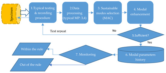 The specimen is tested in accordance with the typical procedure 1, which, in the discussed study, describes specialties of hammer excitation and signals recording. The signals digitally recorded during a single test are the array of input data for modal estimation. Developing this data, the system processor 2 computes primary estimates of modal parameters by applying OMA algorithms to the modal model (common to all specimens). The primary estimates have a high uncertainty due to the influence of random factors, so further processing is required. From the set of primary estimates of a single test, the sustainable modes 3 are selected and grouped. The selected parameters are used for modal enhancement procedures 4 to reduce modal uncertainty. This uncertainty level is controlled by a sufficiency criterion 5, and if it is not met, the test of the specimen is repeated.