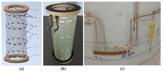 Technologically, the specimen was fabricated starting from the composite cylinder, and then the network of piezoelectric sensors was mounted on its outer surface, covered by the protective composite layer, and, finally, two ring flanges were mounted. The composite cylinder was made of four layers of fiberglass with a density of 300 g/m2, oriented at the angles of 45°/−45° to the cylinder axis, and LG 385 epoxy resin with HG 385 hardener. Then, a network of piezoelectric sensors, with connecting copper wires, was glued with double-sided adhesive tape, as seen in Figure 4c. Four wiring harnesses of D-SUB connectors were soldered to the terminals, one of which can be seen in the photo (Figure 4c down). The sensors were evenly placed in groups of 12 around the circumference in the four circular sections of the cylinder. To protect and isolate the sensor network, a protective layer of satin weave fiberglass, with a density of 50 g/m2, was glued, using the same epoxy resin and a hardener. At the final stage, the cylinder was glued into the annular grooves of the flanges and the harnesses were fixed there (Figure 4b top). The nominal weight of a single completely manufactured specimen (with the flanges and connectors) was 4.37 kg.