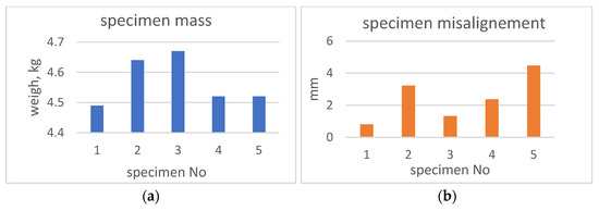 The maximal height difference between specimens was 3 mm. The weight deviation (Figure 5a) from the reference (specimen No. 1) varied from 30 g (No. 4 & 5) to 150–180 g (No. 2, 3) which was more than 4% of the total specimen’s mass.