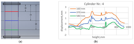 The local wall thickness variation of the cylinder part, caused by the sensor network, was of interest. For this purpose, circumferential scanning of the outer cylinder surface was conducted on the three cross sections of the cylinder part (Figure 6a).