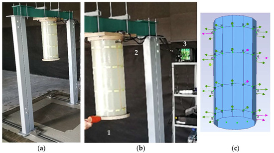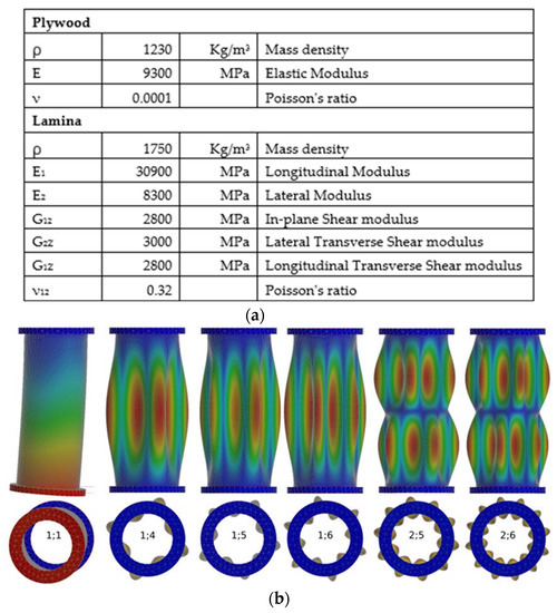 Autodesk Inventor, with built-in Autodesk Nastran-In-Cad solver, was used for modeling. This model allows modeling in a wide range of modes, including low-order ones, such as first bending in two planes. The model has 32,936 elements, including 18,505 shell ones and 85,073 nodes. The size of the elements ranged from 6 mm on the cylinder shell, to 60 mm on the U-frame of the test rig. A further decrease of elements, causing an increase in the number of nodes and elements, resulted in a significant increase in computation time without a noticeable improvement. The cylinder shell orthotropic 2D elements, with Young’s modulus of 30,900 MPa/8300 MPa, were represented as a multi-layer laminated composite element (Laminate). The Laminate consisted of 8 element layers with a thickness of 0.2 mm each, so the total thickness of the Laminate was 1.6 mm. In this model, 2 layers of Lamina with different fiber directions (+45°/−45°) simulated 1 layer of real glass fabric. The parameters of the cylinder part of the model are shown in Figure 8a. Plywood was chosen as the material for the flanges that were modeled using isotropic solid elements (Figure 8a). A specific density of 650 kg/m3 and a Young’s modulus of 9300 MPa were adopted for the flanges. The boundary conditions reflected the vertical cantilever attachment of the specimen (Figure 7a) by its upper flange, using 6 bolts to the horizontal beam of the U-shaped test rig. The model of the test rig, including bolts, consisted of isotropic elements with a Young’s modulus of 2.05 × 105 MPa.