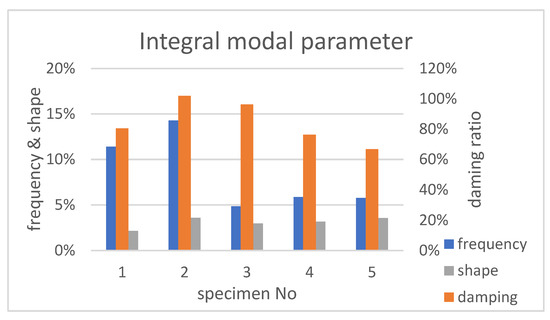 The integral modal parameters (Figure 9) allowed an overall assessment of modal property deviations between specimens (in relation to a typical sample). These parameters clearly illustrated the total scale of modal parameter deviations between specimens: namely, frequency (5–14%), damping (67–102%) and shape (2–4%). The standard deviations of modal parameters (columns 10 of Table 2, Table 3 and Table 4) allowed the determining of the lower limit of their sensitivity to damages in series samples. At a 95% probability level, the modal change sufficient to detect damage had to exceed double standard deviation of the parameter. For example, in order to ensure the detection of damage by modal frequency parameter in any serial sample, it was necessary that the defect caused a frequency change in mode 1;3 of at least 2.8%, and in mode 1;6 of more than 29.4% (see Table 2). Such large-scale changes of modal frequency would have to correspond to very serious structural changes. Even higher (in percentage terms) was the lower limit of sensitivity of the modal damping parameter (Table 3). In contrast to global frequency and damping parameters, the difference in shape between similar modes was much smaller. Therefore, for damage detection (at 95% probability) the shape change of any mode must not be less than 1.3%, and, for some modes, 0.3–0.5% was enough (Table 4). Thus, modal shape parameters had the lowest sensitivity threshold for damage detection in a serial sample and, accordingly, had the greatest diagnostic capabilities.