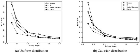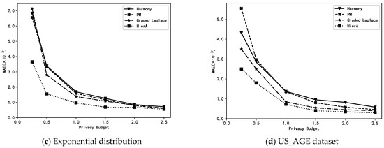 The HierA method (µ = 2) proposed in this paper is compared with the harmony method, PM method and graded Laplace method for MAE when performing mean estimation on synthetic and real datasets with different distributions. Note that the HierA method proposed in this paper is a graded data collection method. The privacy level of user data may vary depending on its size. The harmony and PM methods are single privacy-level methods, and to ensure users’ privacy security, all users in these two methods must use the highest privacy level, i.e., the smallest privacy budget at the time of perturbation. Furthermore, the graded Laplace method uses the same graded settings as the HierA method. The experiments compared the MAE of the different methods when data collection was performed and mean estimation was performed under different privacy budgets ε.