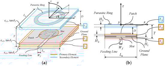The top layer (i.e., ) hosts the secondary element of the antenna, which is implemented as a metallic ring of inner radius and width [Figure 1 and Figure 2c]. Such a parasitic element is “activated” by an air coupling mechanism by placing the layer at a proper distance D above the patch (Figure 1). Overall, the total height of the WWCS antenna turns out to be (Figure 1)