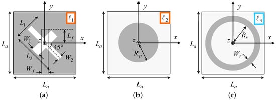 Figure 1 shows a geometric sketch of the layout of the proposed WWCS radiator. The antenna lies on the plane and it comprises square dielectric layers , of side . The thickness, the relative permittivity, and the loss tangent of the l-th () layer are denoted with , , and , respectively. The two stacked bottom layers (i.e., and ) are relative to the primary antenna element, which consists of a circular microstrip patch of radius , printed on the layer [Figure 1 and Figure 2b]. Such a patch is fed with an aperture-coupling mechanism. Towards this end, a cross-shaped slot is etched in the ground plane that separates the layers and [Figure 1 and Figure 2a], which is in turn excited with a microstrip feeding line of width and characteristic impedance . This latter is printed on the bottom face of [Figure 1and Figure 2a]. To maximize the EM coupling, the microstrip line, the slot, and the patch are aligned with respect to the plane (Figure 1). Moreover, the feeding line is terminated into an open-circuited stub whose length [Figure 2a] is properly tuned so that the standing-wave current, induced within the microstrip, is maximum at the slot barycenter [].