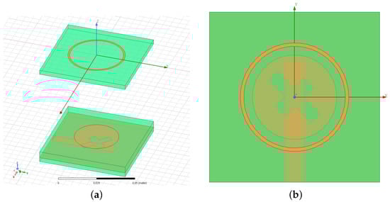 It is worth pointing out that, even though a multiple-layer etching manufacturing process is required, the adopted aperture feeding enables some advantages with respect to a probe/pin-based choice []. For instance, (a) is a wide-band impedance matching, (b) is a an easier construction, since it avoids the vertical pin that would require additional drilling and soldering processes, and (c) is the higher polarization purity and pattern symmetry since the vertical pin would behave as an additional monopole degrading the overall axial ratio (AR) and cross-polar discrimination (XPD). Moreover, the use of independent substrates for both the circular patch (i.e., ) and the feeding line (i.e., ) gives the designer more flexibility in selecting the optimum dielectric support for each antenna “building block” with respect to a solution with coplanar edge feeding (either direct or inset-based) [].