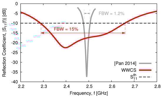 Numerical assessment ( [GHz])—behavior of the reflection coefficient at the antenna input port, , and comparison with the literature results in [].