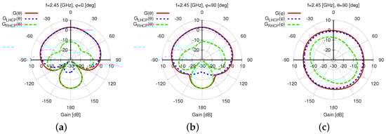 Numerical Assessment( [GHz], [GHz])—Total, , LHCP, , and RHCP, , gain patterns for elevation cuts at (a) [deg] and (b) [deg], and (c) azimuth cut ( [deg]).