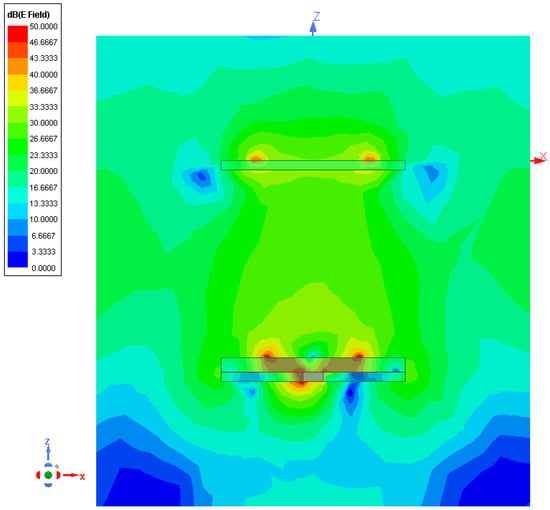 Numerical assessment ( [GHz], [GHz])—2D map of the magnitude of the electric field, , in a vertical surface parallel to the -plane and crossing the center of the WWCS antenna.