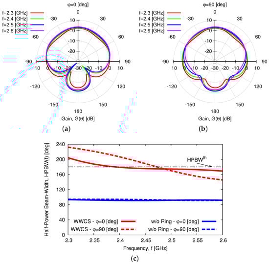 As for the radiation features, Figure 5 shows the gain pattern at , , along the two main elevation planes [i.e., [deg]—Figure 5a and [deg]—Figure 5b] and the azimuth plane [i.e., [deg]—Figure 5c]. Since the HPBW is equal to [deg] [Figure 5a] and [deg] [Figure 5b] on the two vertical cuts, with a good pattern omni-directionality of the whole antenna horizon [Figure 5c], it is reasonable to indicate the proposed antenna such as a wide-beam one suitable for implementing WASAs. It is worth noticing that such a feature has been yielded thanks to the constructive combination of the fields radiated by the primary and secondary sources. To better illustrate the EM phenomena and interactions, Figure 6 shows the 2D plot of the magnitude of the electric field, , on a vertical surface parallel to the -plane and crossing the barycenter of the antenna. As it can be observed, the air coupling between the bottom (primary) and the top (secondary) element of the radiator at hand guarantees a proper excitation of the parasitic element by enabling the generation of a wide beam in the far-field region. The wide-beam behavior of the synthesized WWCS antenna in a wide frequency is “detailed” in Figure 7a,b, where the two elevation gain patterns at frequencies , are given. The remarkable stability, also in frequency, of the wide-beam radiation is pointed out by the plot of the HPBW versus the frequency being [deg] and [deg] for [Figure 7c]. To better understand the advantages of the proposed design, the behavior of the of a planar radiator obtained by removing the top layer (i.e., —Figure 1) is shown as well [Figure 7c]. It turns out that the presence of the parasitic ring in the synthesized WWCS radiator (Figure 1) almost doubles the at the central frequency, thus verifying its effectiveness in yielding a wide-beam behavior [Figure 7c].