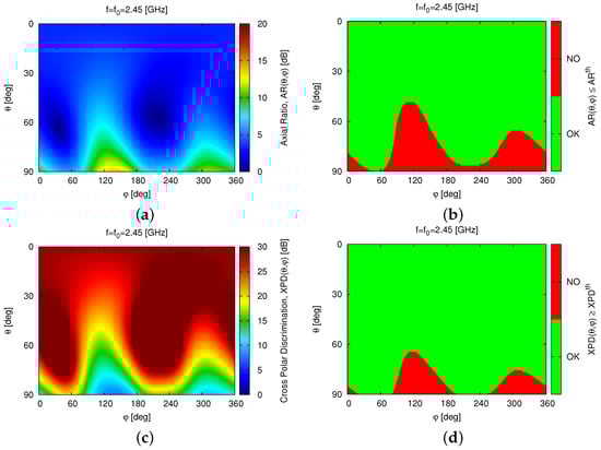 The optimized WWCS layout exhibits the desired LHCP operation and is pointed out by both the co-polar, , and the cross-polar, , gain patterns in Figure 5, where it can be clearly observed that and for [deg] with broadside AR and XPD equal to [dB] and [dB], respectively. Moreover, such a good polarization purity is kept almost unaltered in the complete radiating upper semi-sphere with the exception of the elevation angles close to the antenna end-fire as illustrated by the 2D maps of [Figure 8a] and [Figure 8c] as well as by the corresponding thresholded pictures aimed at highlighting the fulfilment of the design requirements [Figure 8b,d]. It is worth remarking that the slight degradation of both AR and XPD appears only in the most challenging region (i.e., [deg]) and is possibly due to the spurious radiation by the slot along the directions of its major arms (i.e., [deg] and [deg]—Figure 8 and Figure 3).