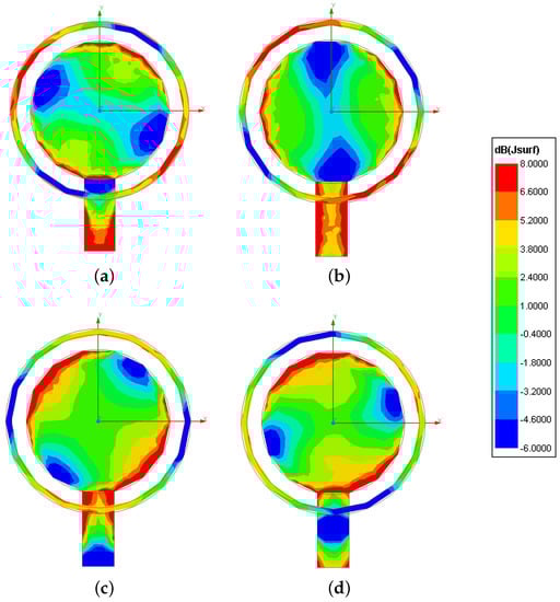 In order to assess the excitation of a LHCP, the plot of the magnitude of the instantaneous surface current density, , is reported in Figure 9 at four consecutive instants [i.e., [sec]—Figure 9a; [sec]—Figure 9b; [sec]—Figure 9c; [sec]—Figure 9d being the period at , ]. One can observe that the fundamental mode is properly excited on the circular patch [] and there is a clock-wise rotation of the corresponding surface current distribution (Figure 9). The vector plot of the electric field distribution at a quota of , , shown in Figure 10 for the same instants, further verifies the desired CP of the radiated wave, which evolves in time according to a LHCP.