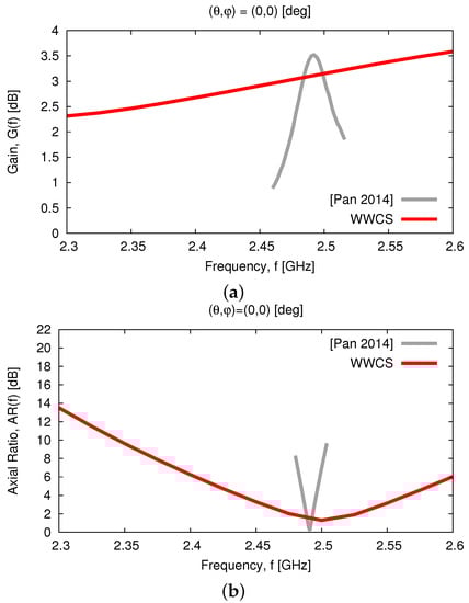For comparison purposes, Figure 11 plots the broadside gain [Figure 11a] and the AR [Figure 11b] within the band of interest of the proposed WWCS model and of the design in []. It turns out that the synthesized radiator exhibits a good AR performance, especially within the band [GHz] where [dB] [], that results in an AR bandwidth (ARBW) equal to , while [i.e., an improvement by times—Figure 11b]. A similar outcome is yielded for the 3 [dB]-bandwidth, as well, since and [i.e., an improvement by times—Figure 11b].