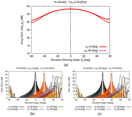 Numerical Assessment ( [GHz], [GHz]—) —Plot of (a) the array gain in the angular steering direction, (, ), when scanning the beam towards [deg] and [deg] or [deg] along with the corresponding far-field patterns at (b) [deg] and (c) [deg].