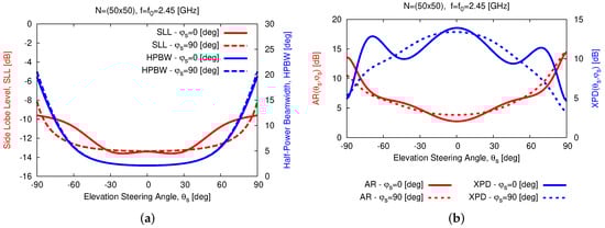 Numerical Assessment ( [GHz], [GHz]—) —Plot of the array (a) SLL/HPBW and (b) AR/XPD when scanning the beam towards [deg] and [deg] or [deg], respectively.