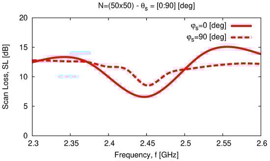 Similar outcomes can be inferred for the array HPBW as well, since [deg] for [deg], while it rapidly increases outside such an angular interval because of the beam broadening effect [] [i.e., [deg] for [deg]—Figure 13a and [Figure 12b,c]. Moreover, a good polarization purity is yielded in the whole scan range as indicated by the plot of both the AR and the XPD along the angular steering direction, since [dB] and [dB] when [deg] and [deg] [Figure 13b]. Finally, let us note that the WASA properties of the array are confirmed within the frequency range of interest (Figure 14) where [dB] for in both elevation planes.