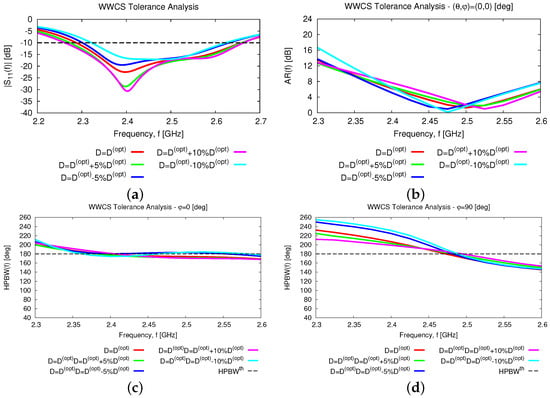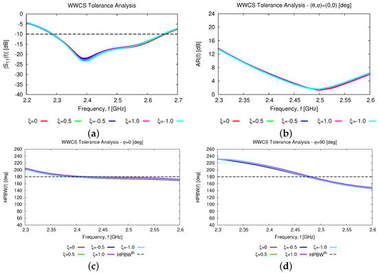 Numerical Assessment ( [GHz])—Behavior of the (a) reflection coefficient, , (b) axial ratio, , and along the (c) [deg] and (d) [deg] elevation planes of the WWCS radiating element for different settings of the manufacturing tolerance on the feeding line () and the parasitic ring () widths.