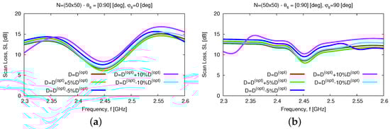 Numerical Assessment ( [GHz]—)—SL performance versus frequency when steering the beam towards [deg] and (a) [deg] or (b) [deg] and assuming that the height of the parasitic element, D, is affected by manufacturing deviations of and from the nominal value (Table 2).