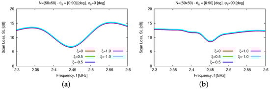 Thanks to the wide-beam nature of the WWCS elementary radiator, the array exhibits good scan loss (SL) performance [], as illustrated by the patterns at different values of the scan angle for both [deg] [Figure 12b] and [deg] [Figure 12c]. The SL on both elevation planes is always smaller than [dB] at the central frequency [Figure 12a]. Moreover, it is worth noticing that there is a good stability of the sidelobe level (SLL) when scanning the beam on both planes [i.e., [dB]—Figure 13a].