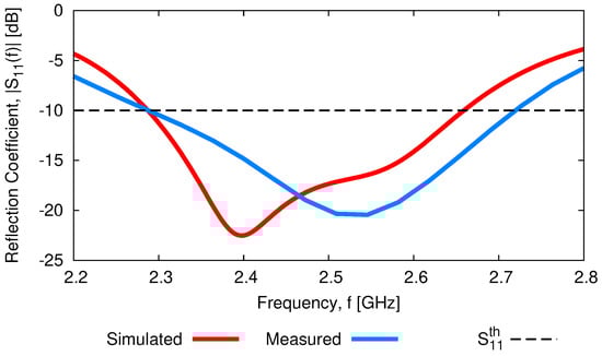 Experimental Assessment—Comparison between the simulated and measured reflection coefficients at the antenna input port.