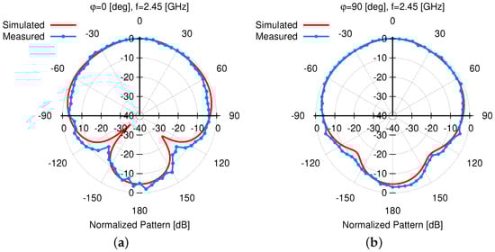 As for the radiation features of the fabricated antenna, the far field patterns have been measured inside an anechoic chamber having dimensions []. The AUT has been placed on a remotely controlled rotating frame and the electric field has been measured by means of a circularly polarized probe connected to a signal analyzer, both placed on a dielectric mast at a distance of 3 [m] from the AUT. In order to avoid field perturbations due to cablings, the AUT has been connected with a short coaxial cable to a small transmitter able to generate a constant amplitude and frequency signal at [GHz]. The transmitter has been placed just behind the layer of the AUT. Similarly, the presence of a long coaxial cable connected to the field probe has been avoided thanks to the use of the PMM 9060 EMI Receiver/Signal Analyzer (30 [MHz]–6 [GHz]) that can be remotely controlled by means of a fiber optic link. A good matching between the simulated and measured gain pattern has been obtained. As a matter of fact, both pattern cuts along the [deg] [Figure 20a] and the [deg] [Figure 21b] elevation planes closely match the outcomes of the numerical assessment. Moreover, it turns out that the measured HPBW verifies the wide-beam behavior of the radiator on both planes, being [deg] [Figure 21a] and [deg] [Figure 21b], respectively. Finally, the measured gain, AR, and XPD are equal to [dB], [dB], and [dB], respectively, thus verifying a good matching with the simulated values.