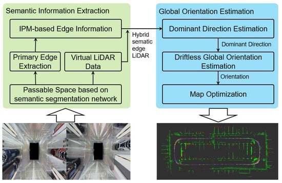 In this work, we built a SLAM framework based on semantic-aware structural information for estimating the robot’s global orientation state, as shown in Figure 1. The framework takes a synthesized surround view image as the input and outputs a drift-free trajectory and a map consisting of marker lines. As we can see, the proposed SLAM system consists mainly of two procedures, structured semantic information extraction and orientation estimation. During the structured semantic information extraction stage, the passable space in the image is firstly extracted with the help of the semantic segmentation network model as a mask for feature extraction; thus, we can improve the computational efficiency of the system while retaining most of the effective information. Since the boundary of the passable area contains geometric information about the environment, it could also be converted into a point cloud representation by LiDAR, which effectively complements the visual feature point information. In addition, since the passable space contains rich pavement marking edges, by further using the distortion characteristics of the reverse-perspective projection process, the distortion edges could be effectively eliminated, and the hybrid edge information could be used for mapping and localization tasks. During the orientation estimation stage, based on the dominant orientation information, the global orientation of each frame can be preliminarily estimated without drift. In order to further improve the anti-interference performance, we built a local map and designed it to optimize the state factor in the local map using the global orientation error constraint. Finally, the estimation of the global orientation is obtained, and a line map that reflects the structure of the real scene can be reconstructed.