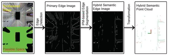 The original synthesized surround view image often contains a large number of ground markings, which can be fed into SLAM systems as high-quality road sign information. However, the information of the synthesized surround view image is also disturbed by a large number of ground spots. At the same time, the reverse-perspective projection transformation during the synthesizing process will distort objects with a certain height on the ground. Therefore, an edge segmentation module needs to be designed to reject the above interference edges, so that the high-quality effective edges on the ground can be retained. The process of hybrid semantic edge extraction is shown in Figure 3.