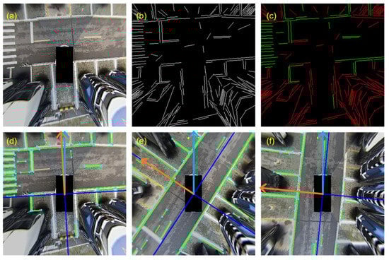 The three subfigures in the upper row illustrate the procedure of structure information extraction: (a) denotes the raw input synthesized image, (b) the extracted raw lines, and (c) the segmentation results, in which green lines denote the preserved marking lines and red lines denote the noisy lines. (d–f) denote the relationship between the local dominant direction and global orientation, in which the orange arrow denotes the local dominant direction and the blue arrow denotes the global dominant direction for the current frame, respectively, while the green lines denote the marking lines.
