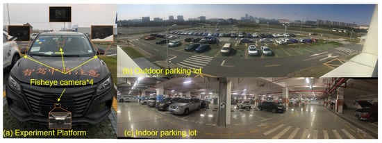 (a) The experimental platform with four fisheye cameras. (b) The outdoor and (c) indoor parking scenes.