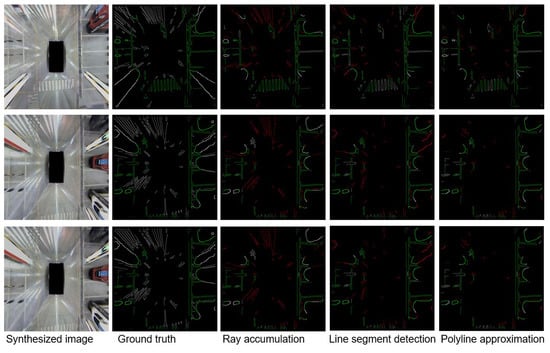 Figure 6 shows some sample results of different edge segmentation methods at the same level of recall. For the original edge picture corresponding to each test sample, the truth value of the edge segmentation result can be given by manual annotation, and then, the difference between the segmentation result of each method and the true value can be compared, including the part that was correctly retained, the part that was mistakenly rejected, and the part that was incorrectly retained. As we can see, the splitting method based on ray accumulation retains too many wrong spot edges, usually because the same long edge is incorrectly divided into different sector areas, and the length of each segment does not reach the set threshold, so it cannot be correctly rejected. The segmentation method based on line segment detection can detect most of the spot edges, but for the less straight edges in the distance, especially the boundaries of the passable area in the distance, the set distance threshold cannot be reached, so it will be incorrectly retained. The segmentation method based on polyline approximation can successfully remove most of the distorted edges, while only a small number of effective edges are erroneously rejected because they are exactly in the direction of the camera’s field of view rays.