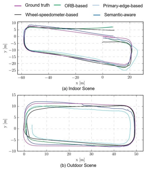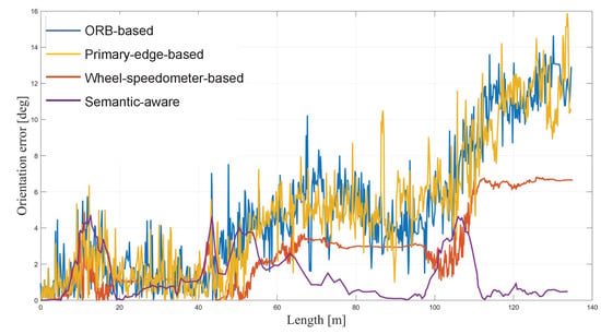 We compared our semantic-structure-based method (semantic-aware) with three other methods, ORB feature-point-based method (ORB-based), primary-edge-based method (primary-edge-based), and wheel-speedometer-based method (wheel-speedometer-based). In Figure 7, we show the comparisons of the orientation estimation errors for the different methods. As the trajectory becomes longer, the orientation angle error of the three comparison methods gradually increases. The main reason is that errors accumulate over time. However, our method achieves a global estimation of the change in direction and avoids the occurrence of accumulated errors. Therefore, the orientation error of this algorithm is independent of the length of the trajectory. When the vehicle turns, the orientation error of all methods increases significantly. This is mainly caused by blurry images caused by fast rotation. Table 2 shows a comparison of the mean orientation estimation errors of the different methods. The average orientation estimation error of the methods presented in this work is stable between 1 and 2 degrees, well below other methods, both indoors and outdoors. This also verifies that, among the different types of feature information, the structure line information is the most robust to the interference factors, and the orientation results estimated based on it are the most accurate.