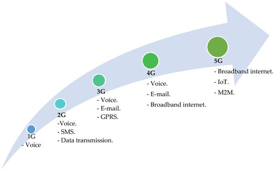 - Sanchez, J.M. Mobile Revolution: From 2G to 5G. In Proceedings of the 2021 IEEE Colombian Conference on Communications and Computing, COLCOM 2021, Virtual, 26–28 May 2021; IEEE: New York, NY, USA; pp. 1–6. [Google Scholar]