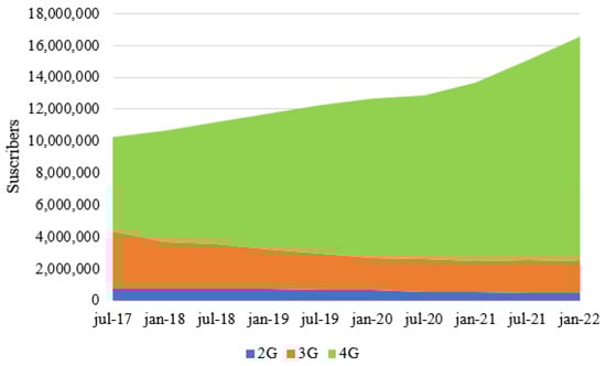 - CRC. Tráfico de Internet Móvil en Colombia se Incrementó en 94.5% en Tercer Trimestre de 2021. Available online: https://www.crcom.gov.co/es/noticias/comunicado-prensa/trafico-internet-movil-en-colombia-se-incremento-en-945-en-tercer#:~:text=Enseptiembrede2021%2Cla,35%2C7 (accessed on 28 June 2022).