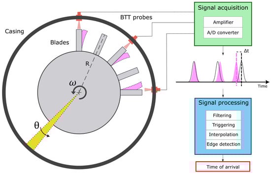 In operating conditions, turbine blades can be subjected to uncontrolled high-amplitude vibrations and thermal-mechanical loads, which are some of the most relevant causes of turbomachinery engine failure [,]. To avoid this and to increase the performance, safety and stability of gas turbine engines, several techniques have been developed in the last 50 years for Structural Health Monitoring (SHM) and Non-Destructive Testing (NDT) of turbomachinery engines blades [,]. Traditionally, a common system to validate the dynamics of rotating blades is the use of strain gauges [,,]. However, while they have high accuracy and well established signal processing algorithms, strain gauges have limited lifetimes in high-temperature conditions, are intrusive, have complicated means of transmitting data from a rotating system and the provided information is limited to instrumented blades []. Unlike vibration, temperature and ultrasound-based techniques [,,,,,,,], the Blade Tip-Timing (BTT) approach is one of the most advanced and versatile in situ techniques for axial turbomachinery blade dynamics measurements [,,]. The principle of the BTT approach is based on the measurement of instantaneous blade tip deflection by detecting delays or advances in the arrival time of the blade tip at fixed angular positions [,]. Besides eddy current, microwave, magnetoresistive and capacitance sensors [,,,,,,], optical fibers are the most employed non-intrusive probes in modern BTT measurement systems because of their accuracy and resolution [,,,,]. The time-of-arrival is measured by sensors installed on the casing. These generate electrical pulse signals when they interact with the rotating blades. As the time-of-arrival is used for determining the amplitude of deflection of each blade, the measurement uncertainty on the time-of-arrival is fundamental for obtaining reliable information on the dynamics of the system. Today, commercial BTT measurement systems are employed in leading manufacturing industries for power generation (gas and steam) and aircraft engines [,]. In fact, the employment of the BTT as an SHM approach can result in cost savings in the validation phase by giving more information concerning the underlying dynamics compared to strain gauge approaches. Moreover, BTT largely extends the lifetime impact of condition-based engine maintenance when validating performance and monitoring turbomachinery operating in power plants and aircraft engines. In fact, the BTT approach may alleviate the growing concern on maintenance costs by replacing scheduled maintenance with as-needed maintenance, saving the cost of unnecessary maintenance on the one hand and preventing unscheduled maintenance on the other hand []. For this reason, in the last decade, an extensive effort has been put into BTT system characterization and development [,,,]. More recently, Tchuisseu et al. [] proposed an approach for the determination of the optimal probe positioning in a BTT system; Wei et al. [] developed a BTT data simulator based on a reduced order model, considering mistuning, rotation effect and speed fluctuation; Bornassi et al. [] built a fitting method based on the 2DOF vibrating model for coupled mode resonances; Mohamed et al. [] presented a process for validating the finite element (FE) stress and deflection predictions of aero-engine compressor blades under non-rotation conditions, giving the quantified uncertainties associated with FE modelling and the measurement processes. However, there is still no technique capable of producing the quantitative measurement uncertainty required at the engine validation stage. In fact, the literature still lacks a complete theoretical model that defines the uncertainty sources introduced by the signal acquisition system and by the data processing algorithms and their influence on the time-of-arrival estimation.