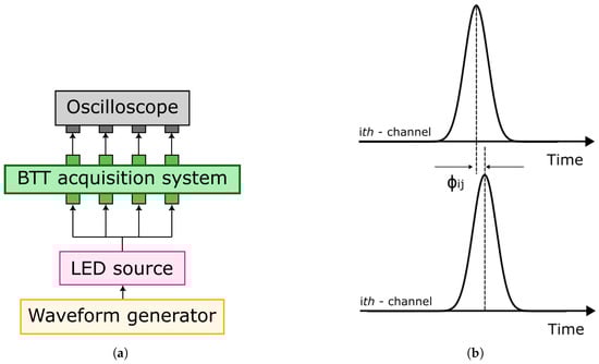 In Figure 3b, is the time shift between the i-th and j-th channels introduced both by the oscilloscope and the BTT measurement system.