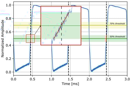 The generated signals were chosen a priori as squared waves with frequencies of 500 Hz, 1 kHz and 2 kHz, to simulate real BTT signals from vibrating blades. The acquired signals are processed as follows: an amplitude normalization is firstly performed to be able to compare more signals simultaneously; a threshold level is set (two different thresholds are used here, 50% and 70% of the signal amplitude on the rising edge); the sampled data points within a 5% range around that threshold are linearly interpolated: in this way, the line of least squares is determined and used to intercept the threshold for defining the arrival time of each peak (see Figure 4). This procedure is repeated for every peak, building a series of arrival times for each input channel.