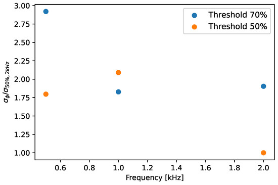 The analysis focusing on the influence of the acquisition system on the arrival time enables several considerations. The standard deviation values are shown in Figure 5, normalized by the condition with threshold at 50% and 2 kHz of input frequency.