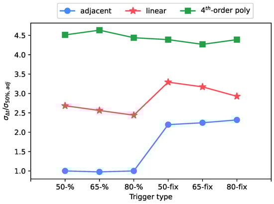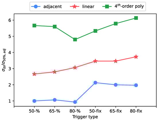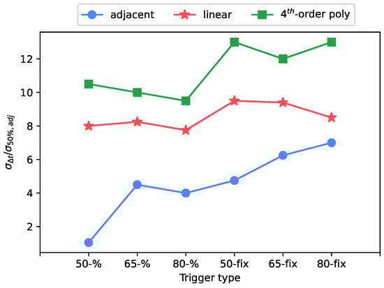 As the difference in the arrival time uncertainty was found to be negligible with regard to the rising–falling edge detection, the experimental results are shown only for the experiments carried out on the rising edge. Similarly, a comparison of the two approaches (i.e., self- and reference-based) did not show relevant differences in this specific research. This outcome is probably due to the ideal conditions selected as a reference, but in other cases, the two approaches could lead to a different discussion. For this reason, the results of the reference-based approach are given and described. The results are shown in terms of standard deviation of estimated arrival time, normalized by the standard deviation evaluated with the adjacent method and with 50% trigger type.