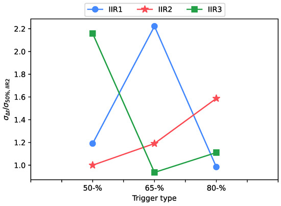 Finally, a further set of six tests with a fixed trigger at 50%, adjacent interpolation and a full-scale level fixed at 1.5 V is acquired. These data are used to compare them with the set of data with a 50% percentage trigger and an IIR retention value of 0 (IIR1 value). Experiments are performed on both rising and falling edges, with three rise time values: 8.1 ms, 4 ms and 2.7 ms, and are presented in Figure 9 as normalized by the standard deviation evaluated with IIR2 value at 50% trigger type.