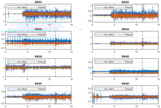 Raw and band pass filtered EMG data for one trial of subject number 7. EMG1 to EMG8 represent Deltoid Anterior, Pectoralis Major Clavicular, Pectoralis Major Sternal, Biceps Brachii, Trapezius Descending, Deltoid Posterior, Latissimus Dorsi and Triceps Brachii, respectively. The black dashed line represents the perturbation instant.