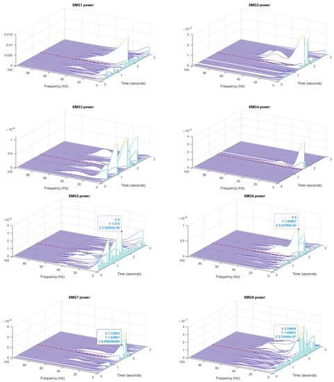 In this strategy, the raw data were first rectified and high pass filtered at 20 Hz by 6th order Butterworth filter to remove motion and electrocardiogram (ECG) artifacts. Then, the nonlinear Teager–Kaiser Energy Operator (TKEO) [] was employed and the data were filtered again (6th order, zero-phase low-pass filter at 50 Hz) for smoothing the signal. The TKEO function (T) is defined as below: