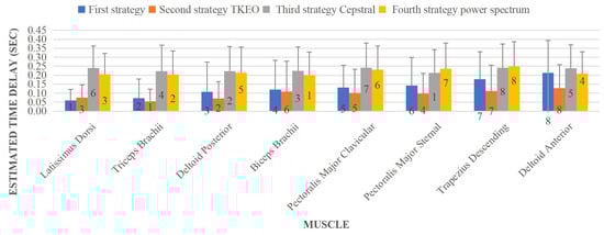 In the muscle main effect, the estimated time delay of Triceps Brachii was significantly different with Deltoid Anterior, Pectoralis Major Clavicular and Trapezius Descending muscles. Figure 7 presents mean and SD values of all estimated time delays for all muscles in each strategy. The estimated time delay values by each the first and second strategies are significantly different compared to the third and fourth strategies.