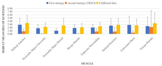 The results of Kurtosis robustness analysis are shown in Figure 6. It can be observed that the TKEO technique could appropriately remove the ECG and motion artifacts in muscle activities. In contrast, the results for the first strategy showed that the value is far from zero as well for the Gaussian distribution, and its value is even closer to the unfiltered data, which shows less performance in removing ECG and motion artifacts compared with the TKEO strategy.