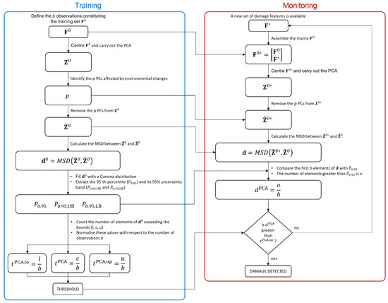 Finally, the possible presence of a damage is assessed if exceeds . This indeed means that more than 5% of the first b elements of exceed the 95th percentile (with a confidence level of 95%), implying that the new does not belong to the Gamma distribution fitted on , thus suggesting the presence of damage. Finally, the main steps required by the proposed PCA-based approach are shown in the flowchart reported in Figure 2.