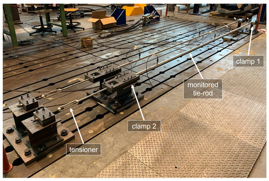 Clamps made from steel plates are located at the two ends of the beam, to provide the constraints. The plates are in contact with the upper and lower faces of the tie-rod and they are held together by bolted joints. During the installation, the bolted joints of one of the two clamps (clamp 1 in Figure 3) were tightened, while the ones of the other clamp (clamp 2 in Figure 3) were left loose. In this way, since the beam was not fully constrained along the axial direction, a tension was applied through a tensioner. When a tension of 8000 N was applied to the tie-rod, also the bolted joints of clamp 2 were tightened up, to finally obtain a tensioned beam with a clamped-clamped constraint configuration.