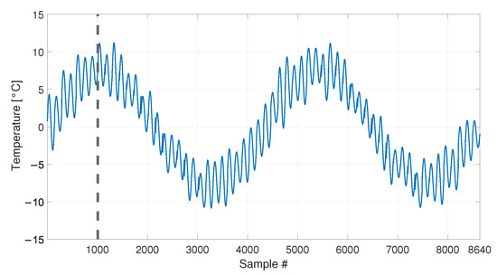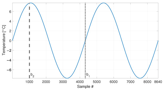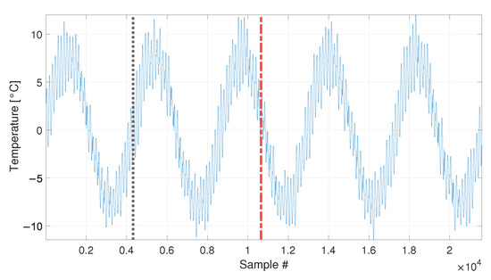Temperature trends, made by either a single sinusoidal trend or two sinusoidal trends, are simulated. If the latter case is considered, both long-term and short-term cyclic trends are present, to mimic seasonal and daily temperature fluctuations, respectively. A simple sine function with amplitude equal to 8 °C and mean equal to 0 °C is used for the long-term temperature trend, which represents the seasonal trend of the mean daily temperature. A series of sinusoidal functions characterized by a shorter period are used to represent the cyclic daily fluctuations. Each of the short-term sinusoidal functions has mean equal to 0 °C and amplitude which is randomly extracted from uniformly distributed numbers in the interval between 1.5 and 4 °C, to simulate that the thermal excursion may change from day to day. The two trends, i.e., the long-term sine function and the series of short-term trends, are summed up, to obtain the simulated temperature with two cyclic components. Conversely, simulated temperature trends with a single cyclic component are pure sines with amplitude equal to 8 °C, as the seasonal trend described above. The temperature values adopted to define the amplitudes of short-term and long-term trends are similar to those registered by meteorological outdoor stations, located in the north of Italy. Finally, the possibility to simulate eigenfrequency trends as function of the temperature allows also to use real temperature data as an input (see Section 3.4 and Section 3.5). Also in this case, temperature data are represented as variations with respect to a reference mean value.