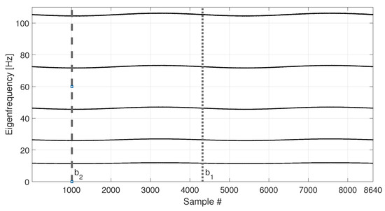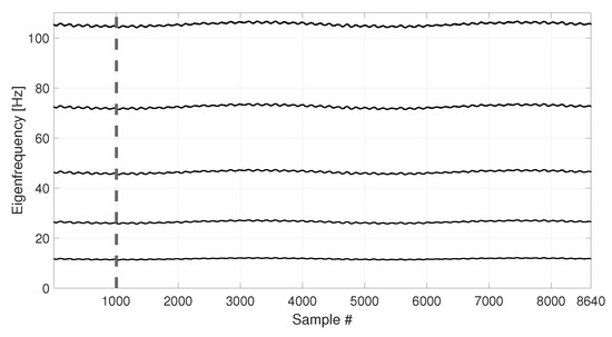 The length of the data set (i.e., n) defines the sensitivity and the readiness of the method in detecting the damage, as will be mentioned later in the paper. Indeed, if n is much lower than b, and contains data referring to an altered condition, their weight in the coordinate transformation of will be low. If n is much higher than b, when an alteration occurs the method will show the damage effect only when a certain number of damaged samples will replace the undamaged ones in . This translates in a transient effect and the higher n with respect to b is, the slower the transient is. In this application we, thus, choose to use as a compromise.