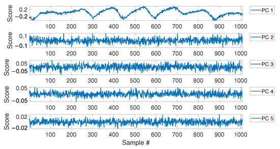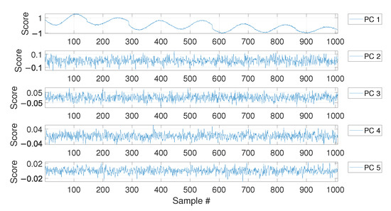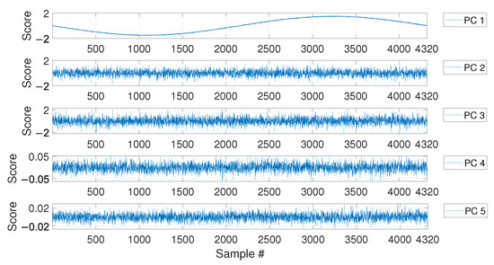 where is an matrix (the loading matrix). The matrix contains the scores in the principal directions of , arranged such as the first column contains the scores related to the PC accounting for the largest variance, the second column contains the scores related to the PC accounting for the second largest variance, and so on. The matrix can be evaluated, for example, by adopting the singular value decomposition. The reader can refer to [52] for a complete theory on the topic.